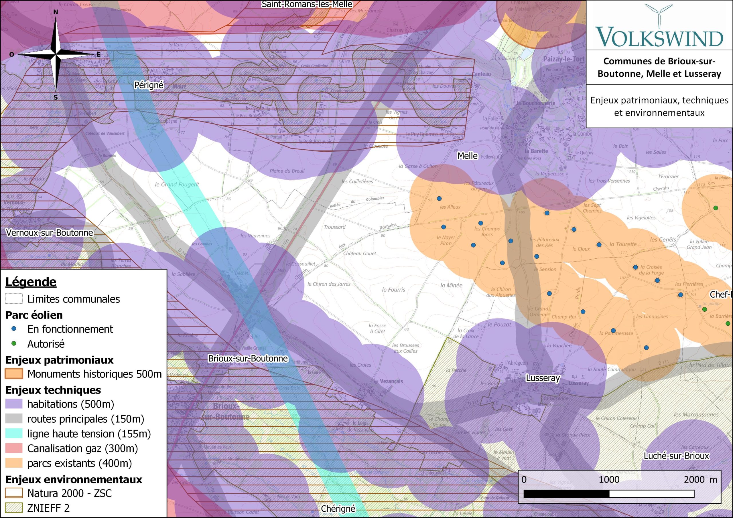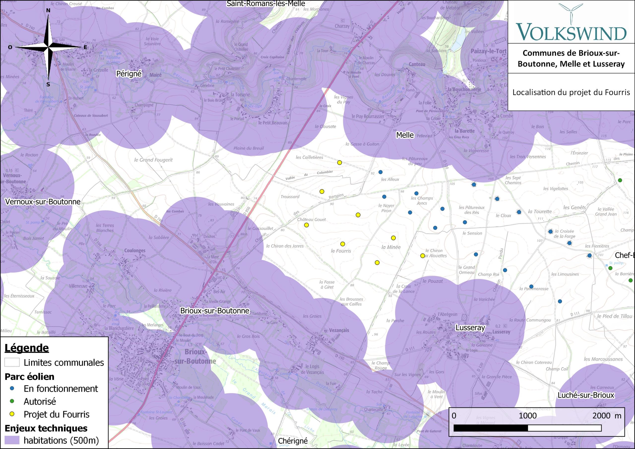 La zone de projet est située à cheval sur les communes de Lusseray, Brioux-sur-Boutonne et Melle. Cette zone a été retenue pour étudier la possibilité d’implantation d’un parc éolien, en raison des avantages suivants :